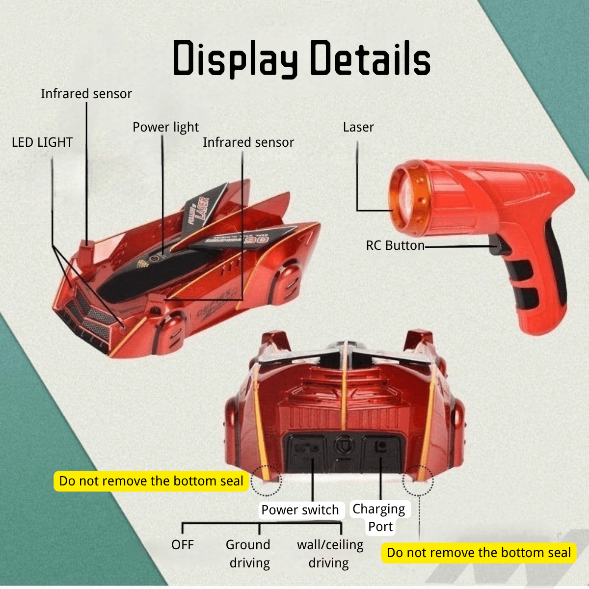 The car uses a built-in vacuum system to create suction, allowing it to stick to smooth vertical surfaces like walls, windows, and even ceilings. Just switch to “Wall Mode” and start driving!